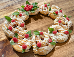 Celebrate Christmas morning or indulge in a Christmas Eve midnight snack with a cinnamon roll wreath! Consisting of a whipped brown butter and cinnamon sugar filling and topped with vanilla cream frosting, fresh raspberries and mint leaves, this edible centerpiece… read more