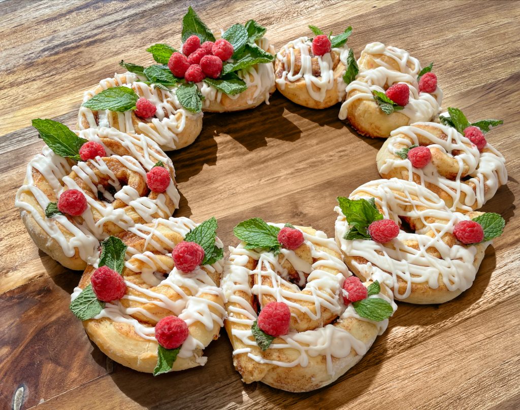 Celebrate Christmas morning or indulge in a Christmas Eve midnight snack with a cinnamon roll wreath! Consisting of a whipped brown butter and cinnamon sugar filling and topped with vanilla cream frosting, fresh raspberries and mint leaves, this edible centerpiece is the perfect combination of classic holiday sweetness and elegance.